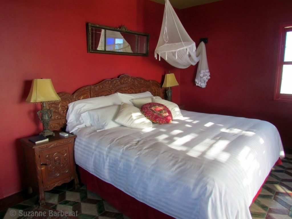 Each of the Hotel California’s 11 guest rooms is uniquely decorated in eye-catching colors and original art. The furnishings are of dark wood and iron, and fabrics are in deep reds, blues, and greens. The beds are comfortable and each room is equipped with air conditioning and ceiling fan.